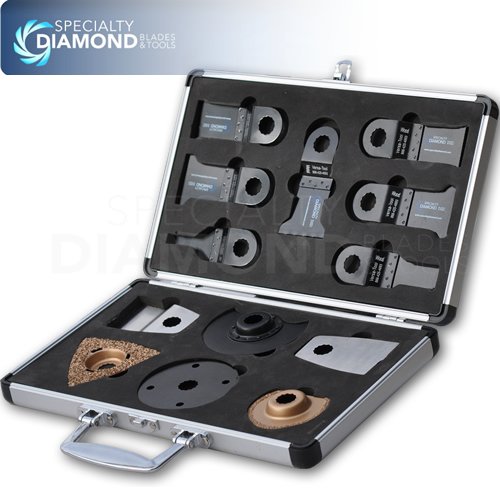 Contractors pack, professional selection of top blades used in job site construction duties.Custom aluminum organizer keeps your blades in one place and free from accidental loss or damage.Compatible with Rockwell Sonicrafter.Exacting arbor specs allows multiple position settings for slip free operation at varying angles.Thick gauge metals and high quality manufacturing techniques insure superior wear tolerance and life..rockwell power tools Versa-Tool SBMASTER 13 Piece Master Accessory Collection With Custom Aluminum Case For Use On Rockwell Sonicrafter Features.